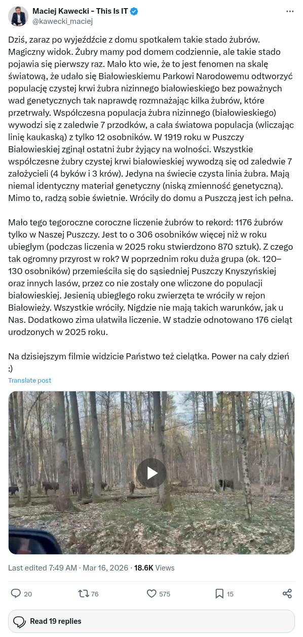 Dziś, zaraz po wyjeźdźcie z domu spotkałem takie stado żubrów. Magiczny widok. Żubry mamy pod domem codziennie, ale takie stado pojawia się pierwszy raz. Mało kto wie, że to jest fenomen na skalę światową, że udało się Białowieskiemu Parkowi Narodowemu odtworzyć populację czystej krwi żubra nizinnego białowieskiego bez poważnych wad genetycznych tak naprawdę rozmnażając kilka żubrów, które przetrwały. Współczesna populacja żubra nizinnego (białowieskiego) wywodzi się z zaledwie 7 przodków, a cała światowa populacja (wliczając linię kaukaską) z tylko 12 osobników. W 1919 roku w Puszczy Białowieskiej zginął ostatni żubr żyjący na wolności. Wszystkie współczesne żubry czystej krwi białowieskiej wywodzą się od zaledwie 7 założycieli (4 byków i 3 krów). Jedyna na świecie czysta linia żubra. Mają niemal identyczny materiał genetyczny (niską zmienność genetyczną). Mimo to, radzą sobie świetnie. Wróciły do domu a Puszczą jest ich pełna. Mało tego tegoroczne coroczne liczenie żubrów to rekord: 1176 żubrów tylko w Naszej Puszczy. Jest to o 306 osobników więcej niż w roku ubiegłym (podczas liczenia w 2025 roku stwierdzono 870 sztuk). Z czego tak ogromny przyrost w rok? W poprzednim roku duża grupa (ok. 120–130 osobników) przemieściła się do sąsiedniej Puszczy Knyszyńskiej oraz innych lasów, przez co nie zostały one wliczone do populacji białowieskiej. Jesienią ubiegłego roku zwierzęta te wróciły w rejon Białowieży. Wszystkie wróciły. Nigdzie nie mają takich warunków, jak u Nas. Dodatkowo zima ułatwiła liczenie. W stadzie odnotowano 176 cieląt urodzonych w 2025 roku. Na dzisiejszym filmie widzicie Państwo też cielątka. Power na cały dzień :)