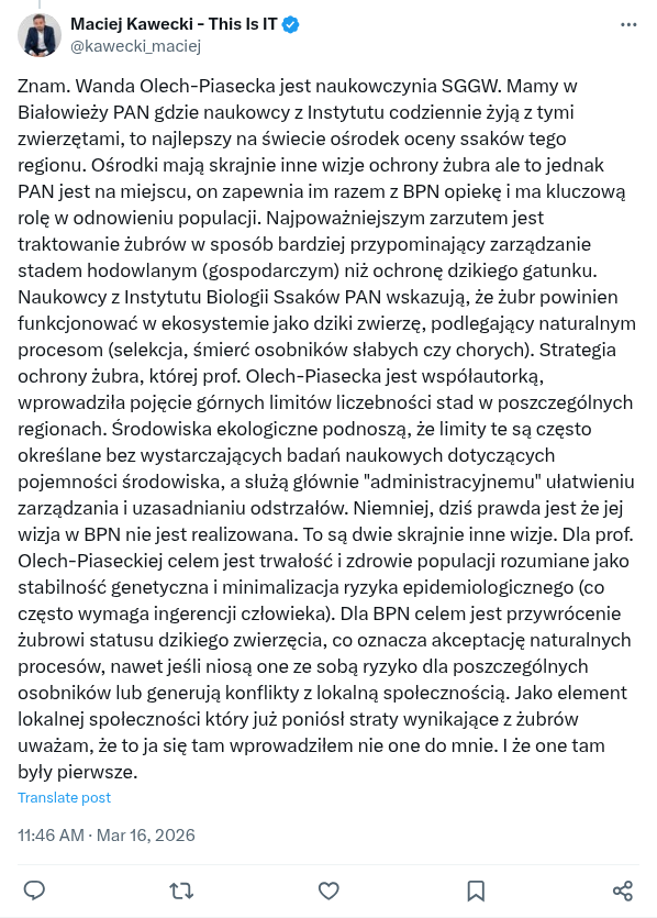 Znam. Wanda Olech-Piasecka jest naukowczynia SGGW. Mamy w Białowieży PAN gdzie naukowcy z Instytutu codziennie żyją z tymi zwierzętami, to najlepszy na świecie ośrodek oceny ssaków tego regionu. Ośrodki mają skrajnie inne wizje ochrony żubra ale to jednak PAN jest na miejscu, on zapewnia im razem z BPN opiekę i ma kluczową rolę w odnowieniu populacji. Najpoważniejszym zarzutem jest traktowanie żubrów w sposób bardziej przypominający zarządzanie stadem hodowlanym (gospodarczym) niż ochronę dzikiego gatunku. Naukowcy z Instytutu Biologii Ssaków PAN wskazują, że żubr powinien funkcjonować w ekosystemie jako dziki zwierzę, podlegający naturalnym procesom (selekcja, śmierć osobników słabych czy chorych). Strategia ochrony żubra, której prof. Olech-Piasecka jest współautorką, wprowadziła pojęcie górnych limitów liczebności stad w poszczególnych regionach. Środowiska ekologiczne podnoszą, że limity te są często określane bez wystarczających badań naukowych dotyczących pojemności środowiska, a służą głównie "administracyjnemu" ułatwieniu zarządzania i uzasadnianiu odstrzałów. Niemniej, dziś prawda jest że jej wizja w BPN nie jest realizowana. To są dwie skrajnie inne wizje. Dla prof. Olech-Piaseckiej celem jest trwałość i zdrowie populacji rozumiane jako stabilność genetyczna i minimalizacja ryzyka epidemiologicznego (co często wymaga ingerencji człowieka). Dla BPN celem jest przywrócenie żubrowi statusu dzikiego zwierzęcia, co oznacza akceptację naturalnych procesów, nawet jeśli niosą one ze sobą ryzyko dla poszczególnych osobników lub generują konflikty z lokalną społecznością. Jako element lokalnej społeczności który już poniósł straty wynikające z żubrów uważam, że to ja się tam wprowadziłem nie one do mnie. I że one tam były pierwsze.