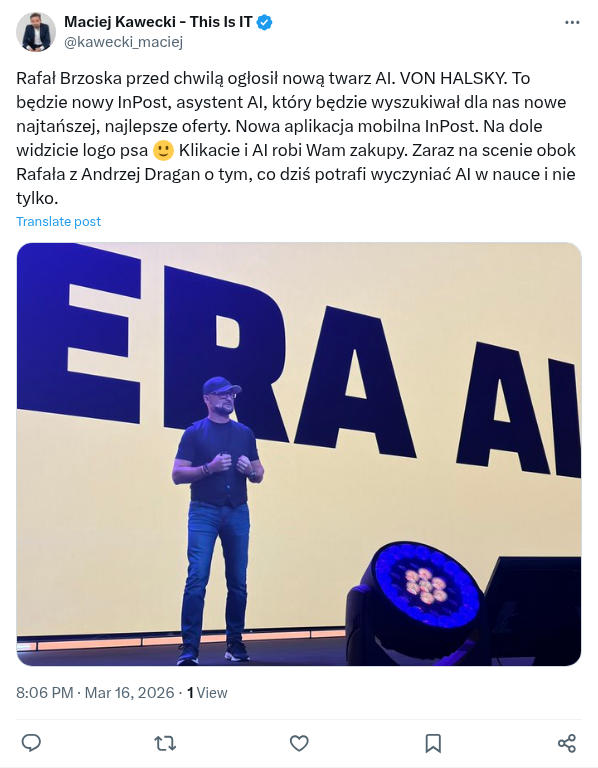 Rafał Brzoska przed chwilą ogłosił nową twarz AI. VON HALSKY. To będzie nowy InPost, asystent AI, który będzie wyszukiwał dla nas nowe najtańszej, najlepsze oferty. Nowa aplikacja mobilna InPost. Na dole widzicie logo psa 🙂 Klikacie i AI robi Wam zakupy. Zaraz na scenie obok Rafała z Andrzej Dragan o tym, co dziś potrafi wyczyniać AI w nauce i nie tylko.