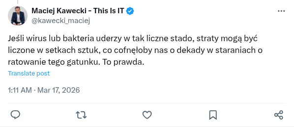 @Goal1916 Jeśli wirus lub bakteria uderzy w tak liczne stado, straty mogą być liczone w setkach sztuk, co cofnęłoby nas o dekady w staraniach o ratowanie tego gatunku. To prawda.