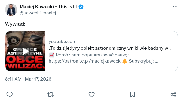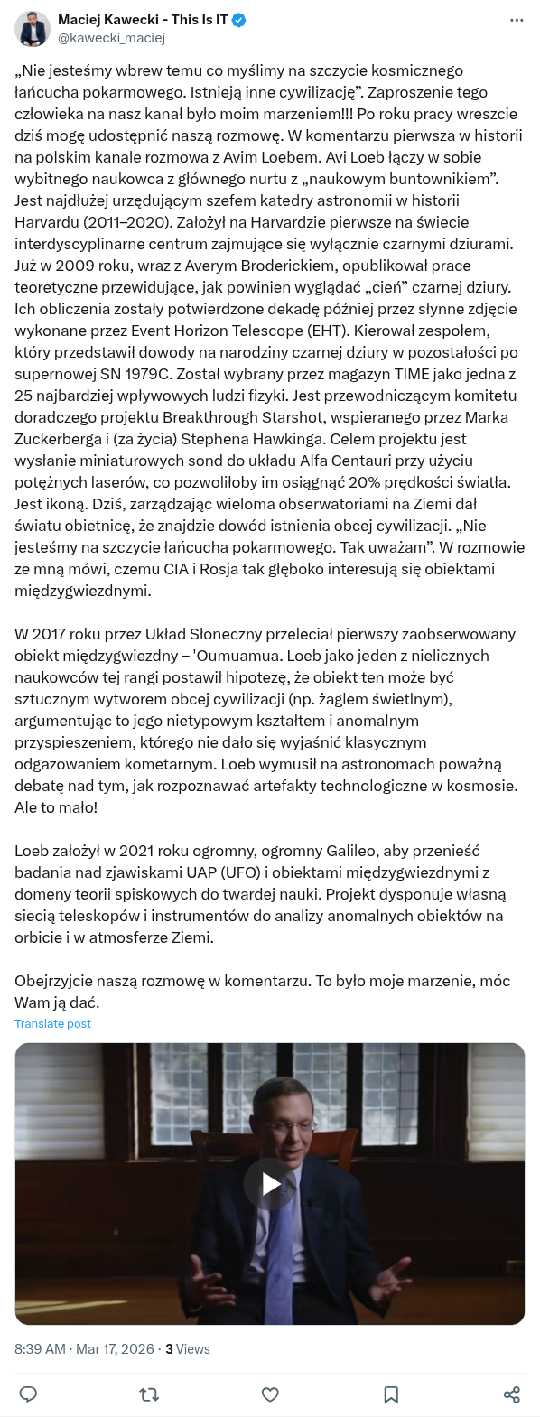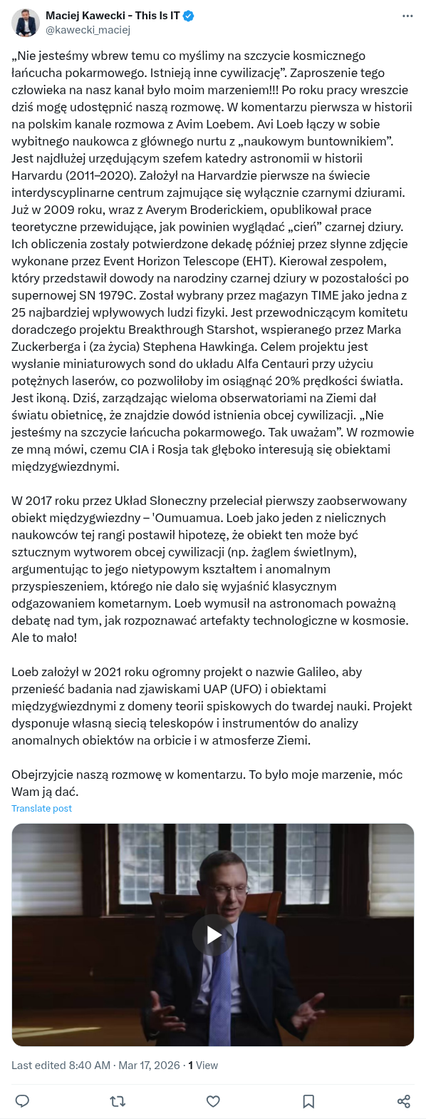 „Nie jesteśmy wbrew temu co myślimy na szczycie kosmicznego łańcucha pokarmowego. Istnieją inne cywilizację”. Zaproszenie tego człowieka na nasz kanał było moim marzeniem!!! Po roku pracy wreszcie dziś mogę udostępnić naszą rozmowę. W komentarzu pierwsza w historii na polskim kanale rozmowa z Avim Loebem. Avi Loeb łączy w sobie wybitnego naukowca z głównego nurtu z „naukowym buntownikiem”. Jest najdłużej urzędującym szefem katedry astronomii w historii Harvardu (2011–2020). Założył na Harvardzie pierwsze na świecie interdyscyplinarne centrum zajmujące się wyłącznie czarnymi dziurami. Już w 2009 roku, wraz z Averym Broderickiem, opublikował prace teoretyczne przewidujące, jak powinien wyglądać „cień” czarnej dziury. Ich obliczenia zostały potwierdzone dekadę później przez słynne zdjęcie wykonane przez Event Horizon Telescope (EHT). Kierował zespołem, który przedstawił dowody na narodziny czarnej dziury w pozostałości po supernowej SN 1979C. Został wybrany przez magazyn TIME jako jedna z 25 najbardziej wpływowych ludzi fizyki. Jest przewodniczącym komitetu doradczego projektu Breakthrough Starshot, wspieranego przez Marka Zuckerberga i (za życia) Stephena Hawkinga. Celem projektu jest wysłanie miniaturowych sond do układu Alfa Centauri przy użyciu potężnych laserów, co pozwoliłoby im osiągnąć 20% prędkości światła. Jest ikoną. Dziś, zarządzając wieloma obserwatoriami na Ziemi dał światu obietnicę, że znajdzie dowód istnienia obcej cywilizacji. „Nie jesteśmy na szczycie łańcucha pokarmowego. Tak uważam”. W rozmowie ze mną mówi, czemu CIA i Rosja tak głęboko interesują się obiektami międzygwiezdnymi. W 2017 roku przez Układ Słoneczny przeleciał pierwszy zaobserwowany obiekt międzygwiezdny – 'Oumuamua. Loeb jako jeden z nielicznych naukowców tej rangi postawił hipotezę, że obiekt ten może być sztucznym wytworem obcej cywilizacji (np. żaglem świetlnym), argumentując to jego nietypowym kształtem i anomalnym przyspieszeniem, którego nie dało się wyjaśnić klasycznym odgazowaniem kometarnym. Loeb wymusił na astronomach poważną debatę nad tym, jak rozpoznawać artefakty technologiczne w kosmosie. Ale to mało! Loeb założył w 2021 roku ogromny projekt o nazwie Galileo, aby przenieść badania nad zjawiskami UAP (UFO) i obiektami międzygwiezdnymi z domeny teorii spiskowych do twardej nauki. Projekt dysponuje własną siecią teleskopów i instrumentów do analizy anomalnych obiektów na orbicie i w atmosferze Ziemi. Obejrzyjcie naszą rozmowę w komentarzu. To było moje marzenie, móc Wam ją dać.