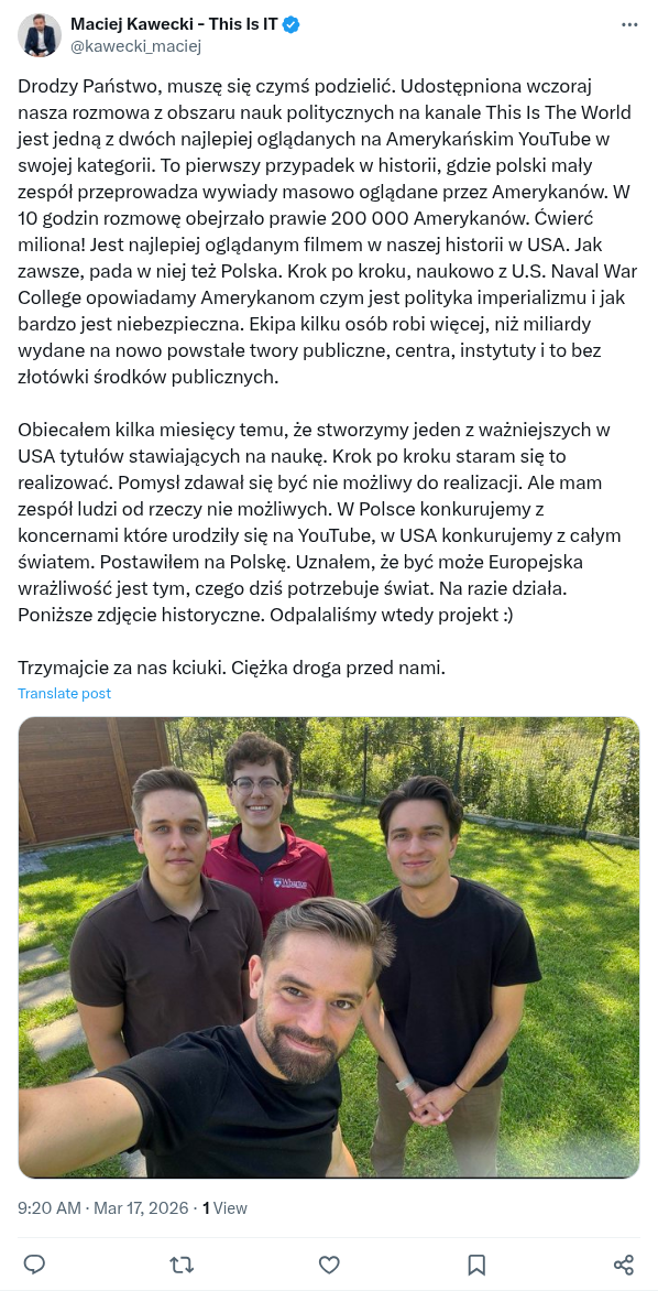 Drodzy Państwo, muszę się czymś podzielić. Udostępniona wczoraj nasza rozmowa z obszaru nauk politycznych na kanale This Is The World jest jedną z dwóch najlepiej oglądanych na Amerykańskim YouTube w swojej kategorii. To pierwszy przypadek w historii, gdzie polski mały zespół przeprowadza wywiady masowo oglądane przez Amerykanów. W 10 godzin rozmowę obejrzało prawie 200 000 Amerykanów. Ćwierć miliona! Jest najlepiej oglądanym filmem w naszej historii w USA. Jak zawsze, pada w niej też Polska. Krok po kroku, naukowo z U.S. Naval War College opowiadamy Amerykanom czym jest polityka imperializmu i jak bardzo jest niebezpieczna. Ekipa kilku osób robi więcej, niż miliardy wydane na nowo powstałe twory publiczne, centra, instytuty i to bez złotówki środków publicznych. Obiecałem kilka miesięcy temu, że stworzymy jeden z ważniejszych w USA tytułów stawiających na naukę. Krok po kroku staram się to realizować. Pomysł zdawał się być nie możliwy do realizacji. Ale mam zespół ludzi od rzeczy nie możliwych. W Polsce konkurujemy z koncernami które urodziły się na YouTube, w USA konkurujemy z całym światem. Postawiłem na Polskę. Uznałem, że być może Europejska wrażliwość jest tym, czego dziś potrzebuje świat. Na razie działa. Poniższe zdjęcie historyczne. Odpalaliśmy wtedy projekt :) Trzymajcie za nas kciuki. Ciężka droga przed nami.