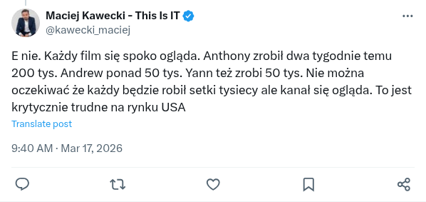@pawel_plx E nie. Każdy film się spoko ogląda. Anthony zrobił dwa tygodnie temu 200 tys. Andrew ponad 50 tys. Yann też zrobi 50 tys. Nie można oczekiwać że każdy będzie robił setki tysiecy ale kanał się ogląda. To jest krytycznie trudne na rynku USA