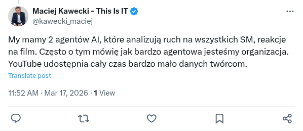 @Marakesz My mamy 2 agentów AI, które analizują ruch na wszystkich SM, reakcje na film. Często o tym mówię jak bardzo agentowa jesteśmy organizacja. YouTube udostępnia cały czas bardzo mało danych twórcom.