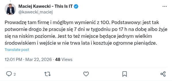 @JurekLoo @KinasRemek Prowadzę tam firmę i mógłbym wymienić z 100. Podstawowy: jest tak potwornie drogo że pracuje się 7 dni w tygodniu po 17 h na dobę albo żyje się na niskim poziomie. Jest to też miejsce będące jednym wielkim środowiskiem i wejście w nie trwa lata i kosztuje ogromne pieniądze.