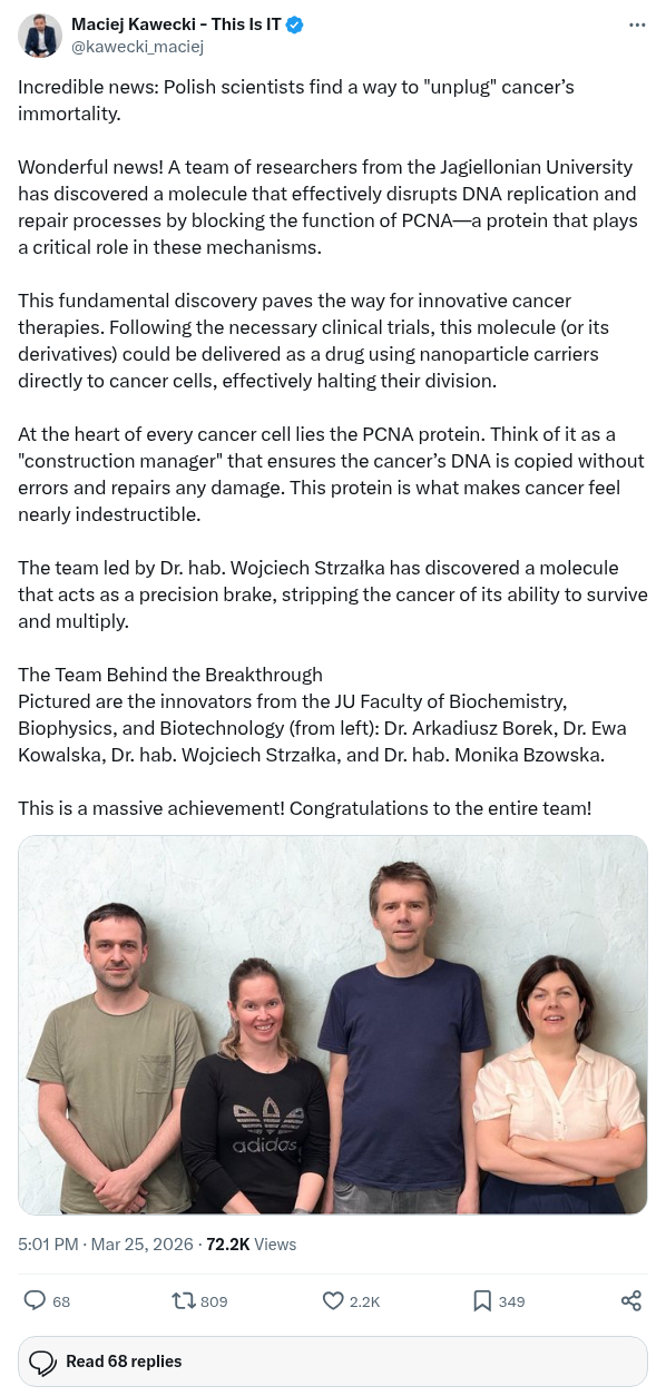 Incredible news: Polish scientists find a way to "unplug" cancer’s immortality. Wonderful news! A team of researchers from the Jagiellonian University has discovered a molecule that effectively disrupts DNA replication and repair processes by blocking the function of PCNA—a protein that plays a critical role in these mechanisms. This fundamental discovery paves the way for innovative cancer therapies. Following the necessary clinical trials, this molecule (or its derivatives) could be delivered as a drug using nanoparticle carriers directly to cancer cells, effectively halting their division. At the heart of every cancer cell lies the PCNA protein. Think of it as a "construction manager" that ensures the cancer’s DNA is copied without errors and repairs any damage. This protein is what makes cancer feel nearly indestructible. The team led by Dr. hab. Wojciech Strzałka has discovered a molecule that acts as a precision brake, stripping the cancer of its ability to survive and multiply. The Team Behind the Breakthrough Pictured are the innovators from the JU Faculty of Biochemistry, Biophysics, and Biotechnology (from left): Dr. Arkadiusz Borek, Dr. Ewa Kowalska, Dr. hab. Wojciech Strzałka, and Dr. hab. Monika Bzowska. This is a massive achievement! Congratulations to the entire team!