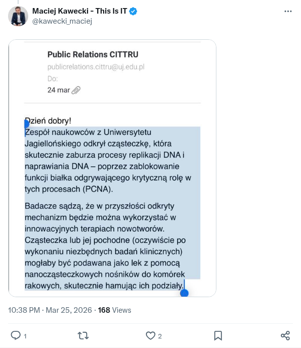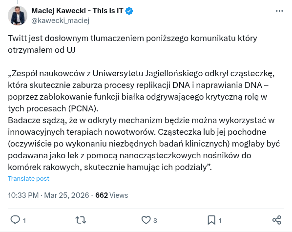 Twitt jest dosłownym tłumaczeniem poniższego komunikatu który otrzymałem od UJ „Zespół naukowców z Uniwersytetu Jagiellońskiego odkrył cząsteczkę, która skutecznie zaburza procesy replikacji DNA i naprawiania DNA – poprzez zablokowanie funkcji białka odgrywającego krytyczną rolę w tych procesach (PCNA). Badacze sądzą, że w odkryty mechanizm będzie można wykorzystać w innowacyjnych terapiach nowotworów. Cząsteczka lub jej pochodne (oczywiście po wykonaniu niezbędnych badań klinicznych) mogłaby być podawana jako lek z pomocą nanocząsteczkowych nośników do komórek rakowych, skutecznie hamując ich podziały”.