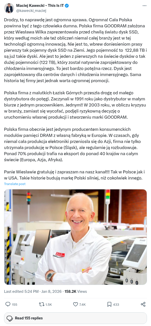 Drodzy, to naprawdę jest ogromna sprawa. Ogromna! Cała Polska powinna być z tego człowieka dumna. Polska firma GOODRAM założona przez Wiesława Wilka zaprezentowała przed chwilą światu dysk SSD, który według moich ale też obliczeń niemal całej branży jest w tej technologii ogromną innowacją. Nie jest to, wbrew doniesieniom prasy pierwszy tak pojemny dysk SSD na Ziemi. Jego pojemność to 122,88 TB i są już takie dyski. Ale jest to jeden z pierwszych na świecie dysków o tak dużej pojemności (122 TB), który został natywnie zaprojektowany do chłodzenia immersyjnego. To jest bardzo potężna rzecz. Dysk jest zaprojektowany dla centrów danych i chłodzenia immersyjnego. Sama historia tej firmy jest jednak warta ogromnej promocji.