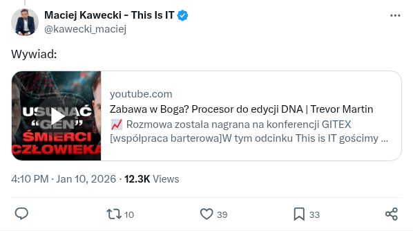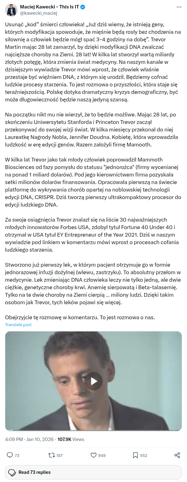 Usunąć „kod” śmierci człowieka! „Już dziś wiemy, że istnieją geny, których modyfikacja spowoduje, że mięśnie będą rosły bez chodzenia na siłownię a człowiek będzie mógł spać 3-4 godziny na dobę”. Trevor Martin mając 28 lat zamarzył, by dzięki modyfikacji DNA zwalczać najcięższe choroby na Ziemi. 28 lat! W kilka lat stworzył wartą miliardy złotych potęgę, która zmienia świat medycyny. Na naszym kanale w dzisiejszym wywiadzie Trevor mówi wprost, że człowiek właśnie przestaje być więźniem DNA, z którym się urodził. Będziemy cofnać ludzkie procesy starzenia. To jest rozmowa o przyszłości, która staje się teraźniejszością. Polskę dotyka dramatyczny kryzys demograficzny, być może długowieczność będzie naszą jedyną szansą.