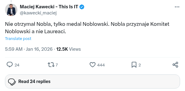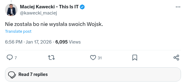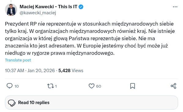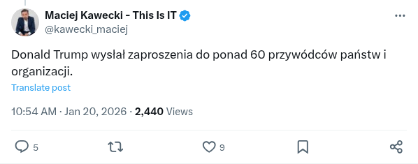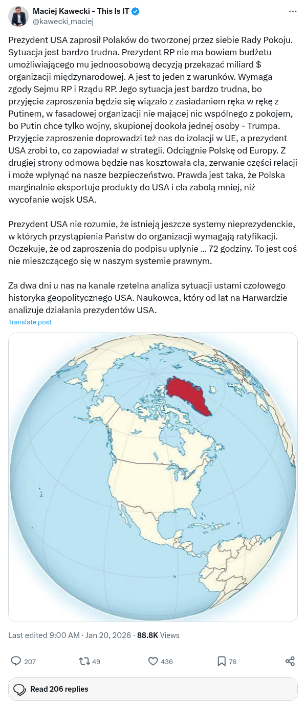 Prezydent USA zaprosił Polaków do tworzonej przez siebie Rady Pokoju. Sytuacja jest bardzo trudna. Prezydent RP nie ma bowiem budżetu umożliwiającego mu jednoosobową decyzją przekazać miliard $ organizacji międzynarodowej. A jest to jeden z warunków. Wymaga zgody Sejmu RP i Rządu RP. Jego sytuacja jest bardzo trudna, bo przyjęcie zaproszenia będzie się wiązało z zasiadaniem ręka w rękę z Putinem, w fasadowej organizacji nie mającej nic wspólnego z pokojem, bo Putin chce tylko wojny, skupionej dookoła jednej osoby - Trumpa. Przyjęcie zaproszenie doprowadzi też nas do izolacji w UE, a prezydent USA zrobi to, co zapowiadał w strategii. Odciągnie Polskę od Europy. Z drugiej strony odmowa będzie nas kosztowała cła, zerwanie części relacji i może wpłynąć na nasze bezpieczeństwo. Prawda jest taka, że Polska marginalnie eksportuje produkty do USA i cła zabolą mniej, niż wycofanie wojsk USA.