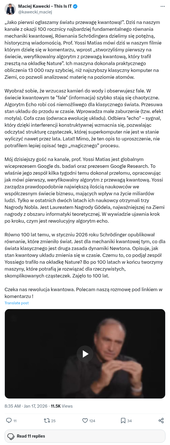 Mój dzisiejszy gość na kanale, prof. Yossi Matias jest globalnym wiceprezesem Google ds. badań oraz prezesem Google Research. To właśnie jego zespół kilka tygodni temu dokonał przełomu, opracowując jak mówi pierwszy, weryfikowalny algorytm z przewagą kwantową. Yossi zarządza prawdopodobnie największą ilością naukowców we współczesnym świecie biznesu, mających wpływ na życie miliardów ludzi. Tylko w ostatnich dwóch latach ich naukowcy otrzymali trzy Nagrody Nobla. Jest Laureatem Nagrody Gödela, najważniejszej na Ziemi nagrody z obszaru informatyki teoretycznej. W wywiadzie ujawnia krok po kroku, czym jest rewolucyjny algorytm echo.