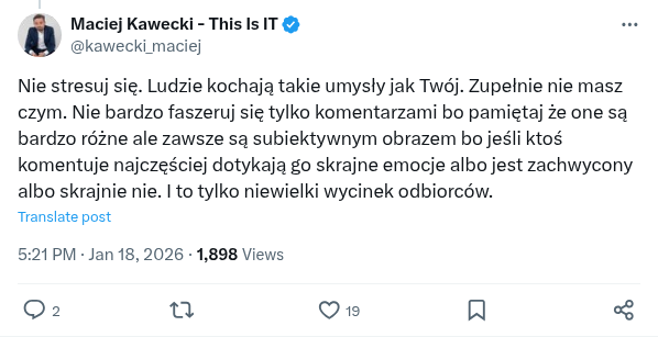 Nie stresuj się. Ludzie kochają takie umysły jak Twój. Zupełnie nie masz czym. Nie bardzo faszeruj się tylko komentarzami bo pamiętaj że one są bardzo różne ale zawsze są subiektywnym obrazem bo jeśli ktoś komentuje najczęściej dotykają go skrajne emocje albo jest zachwycony albo skrajnie nie. I to tylko niewielki wycinek odbiorców.
