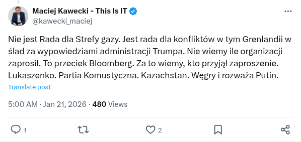 Nie jest Rada dla Strefy gazy. Jest rada dla konfliktów w tym Grenlandii w ślad za wypowiedziami administracji Trumpa. Nie wiemy ile organizacji zaprosił. To przeciek Bloomberg. Za to wiemy, kto przyjął zaproszenie. Lukaszenko. Partia Komustyczna. Kazachstan. Węgry i rozważa Putin.