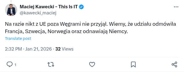 @Johannitter Na razie nikt z UE poza Węgrami nie przyjął. Wiemy, że udziału odmówiła Francja, Szwecja, Norwegia oraz odnawiają Niemcy.