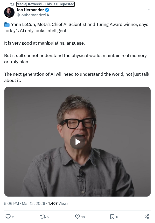 RT @JonhernandezIA: 📁 Yann LeCun, Meta’s Chief AI Scientist and Turing Award winner, says today’s AI only looks intelligent.