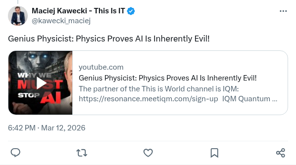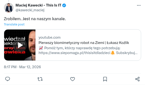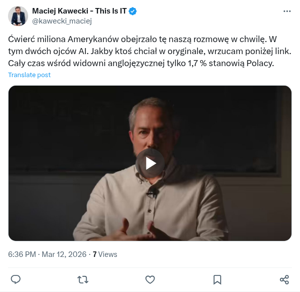 Ćwierć miliona Amerykanów obejrzało tę naszą rozmowę w chwilę. W tym dwóch ojców AI. Jakby ktoś chciał w oryginale, wrzucam poniżej link. Cały czas wśród widowni anglojęzycznej tylko 1,7 % stanowią Polacy. https://pbs.twimg.com/amplify_video_thumb/2032148570321694720/img/x4jW4yMH58bKdPAD.jpg