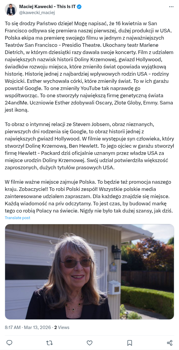 To się drodzy Państwo dzieje! Mogę napisać, że 16 kwietnia w San Francisco odbywa się premiera naszej pierwszej, dużej produkcji w USA. Polska ekipa ma premierę swojego filmu w jednym z najważniejszych Teatrów San Francisco - Presidio Theatre. Ukochany teatr Marlene Dietrich, w którym dziesiątki razy dawała swoje koncerty. Film z udziałem największych nazwisk historii Doliny Krzemowej, gwiazd Hollywood, świadków rozwoju miejsca, które zmieniło świat opowiada wyjątkową historię. Historię jednej z najbardziej wpływowych rodzin USA - rodziny Wojcicki. Esther wychowała córki, które zmieniły świat. To w ich garażu powstał Google. To one zmieniły YouTube tak naprawdę go współtworząc. To one stworzyły największą firmę genetyczną świata 24andMe. Uczniowie Esther zdobywali Oscary, Złote Globy, Emmy. Sama jest ikoną.