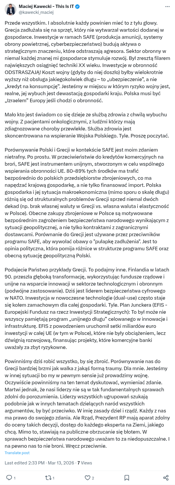 Przede wszystkim. I absolutnie każdy powinien mieć to z tyłu głowy. Grecja zadłużała się na sprzęt, który nie wytwarzał wartości dodanej w gospodarce. Inwestycje w ramach SAFE (produkcja amunicji, systemy obrony powietrznej, cyberbezpieczeństwo) budują aktywa o strategicznym znaczeniu, które odstraszają agresora. Sektor obronny w niemal każdej znanej mi gospodarce stymuluje rozwój. Był zresztą filarem największych osiągnięć techniki XX wieku. Inwestycje w obronność ODSTRASZAJĄ! Koszt wojny (gdyby do niej doszło) byłby wielokrotnie wyższy niż obsługa jakiegokolwiek długu – to „ubezpieczenie”, a nie „kredyt na konsumpcję”. Jesteśmy w miejscu w którym ryzyko wojny jest, realne, jej wybuch jest dewastacją gospodarki kraju. Polska musi być „Izraelem” Europy jeśli chodzi o obronność.