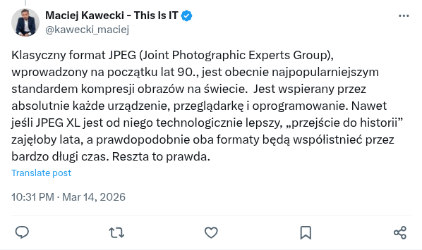 Klasyczny format JPEG (Joint Photographic Experts Group), wprowadzony na początku lat 90., jest obecnie najpopularniejszym standardem kompresji obrazów na świecie. Jest wspierany przez absolutnie każde urządzenie, przeglądarkę i oprogramowanie. Nawet jeśli JPEG XL jest od niego technologicznie lepszy, „przejście do historii” zajęłoby lata, a prawdopodobnie oba formaty będą współistnieć przez bardzo długi czas. Reszta to prawda.