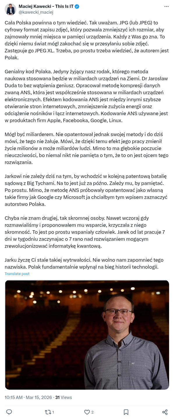 Genialny kod Polaka. Jedyny żyjący nasz rodak, którego metoda naukowa stosowana będzie w miliardach urządzeń na Ziemi. Dr Jarosław Duda to bez wątpienia geniusz. Opracował metodę kompresji danych zwaną ANS, która jest współcześnie stosowana w miliardach urządzeń elektronicznych. Efektem kodowania ANS jest między innymi szybsze otwieranie stron internetowych, zmniejszenie zużycia energii oraz odciążenie nośników i łącz internetowych. Kodowanie ANS używane jest w produktach firm Apple, Facebooka, Google, Linux.