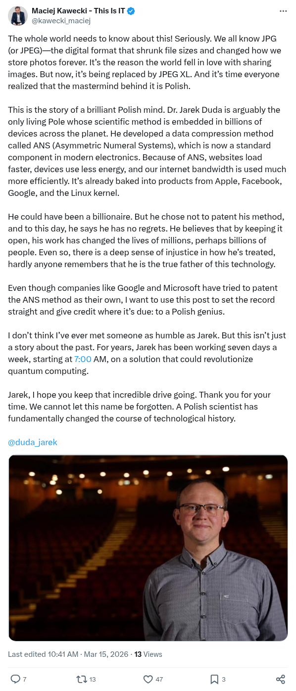 This is the story of a brilliant Polish mind. Dr. Jarek Duda is arguably the only living Pole whose scientific method is embedded in billions of devices across the planet. He developed a data compression method called ANS (Asymmetric Numeral Systems), which is now a standard component in modern electronics. Because of ANS, websites load faster, devices use less energy, and our internet bandwidth is used much more efficiently. It’s already baked into products from Apple, Facebook, Google, and the Linux kernel.