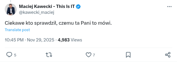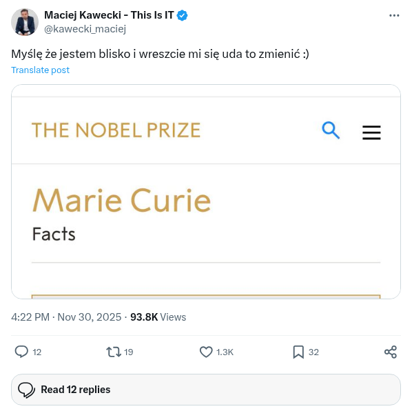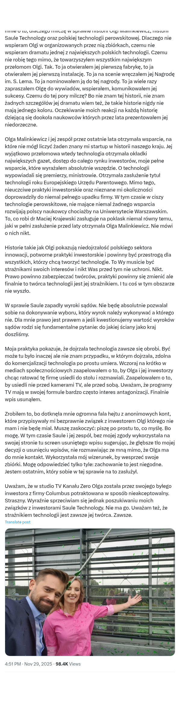 Kilka moich ważnych słów. Drodzy Państwo, bardzo wiele osób pyta mnie o to, dlaczego milczę w sprawie historii Olgi Malinkiewicz, historii Saule Technology oraz polskiej technologii perowskitowej. Dlaczego nie wspieram Olgi w organizowanych przez nią zbiórkach, czemu nie wspieram dramatu jednej z największych polskich technologii. Czemu nie robię tego mimo, że towarzyszyłem wszystkim największym przełomom Olgi. Tak. To ja otwierałem jej pierwszą fabrykę, to ja otwierałem jej pierwszą instalację. To ja na scenie wręczałem jej Nagrodę im. S. Lema. To ja nominowałem ją do tej nagrody. To ja wiele razy zapraszałem Olgę do wywiadów, wspierałem, komunikowałem jej sukcesy. Czemu do tej pory milczę? Bo nie znam tej historii, nie znam żadnych szczegółów jej dramatu wiem też, że takie historie nigdy nie mają jednego koloru. Oczekiwanie moich reakcji na każdą historię dziejącą się dookoła naukowców których przez lata prezentowałem jej niedorzeczne.