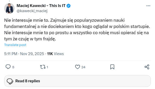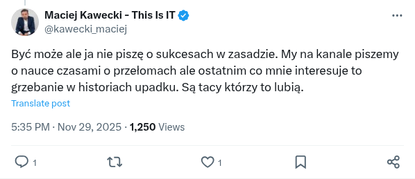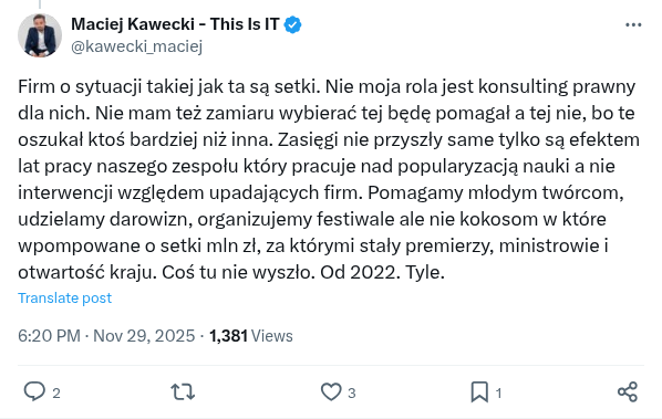 Firm o sytuacji takiej jak ta są setki. Nie moja rola jest konsulting prawny dla nich. Nie mam też zamiaru wybierać tej będę pomagał a tej nie, bo te oszukał ktoś bardziej niż inna. Zasięgi nie przyszły same tylko są efektem lat pracy naszego zespołu który pracuje nad popularyzacją nauki a nie interwencji względem upadających firm. Pomagamy młodym twórcom, udzielamy darowizn, organizujemy festiwale ale nie kokosom w które wpompowane o setki mln zł, za którymi stały premierzy, ministrowie i otwartość kraju. Coś tu nie wyszło. Od 2022. Tyle.