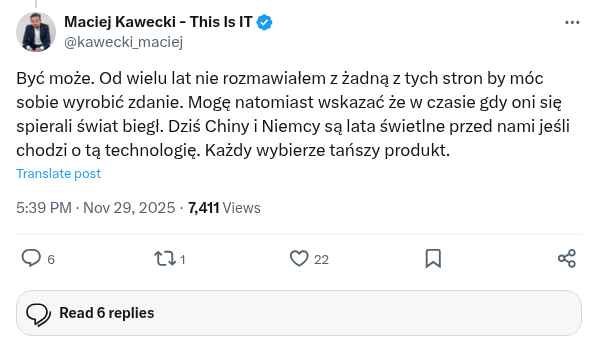 @JaremaWisniowie @OMalinkiewicz Być może. Od wielu lat nie rozmawiałem z żadną z tych stron by móc sobie wyrobić zdanie. Mogę natomiast wskazać że w czasie gdy oni się spierali świat biegł. Dziś Chiny i Niemcy są lata świetlne przed nami jeśli chodzi o tą technologię. Każdy wybierze tańszy produkt.