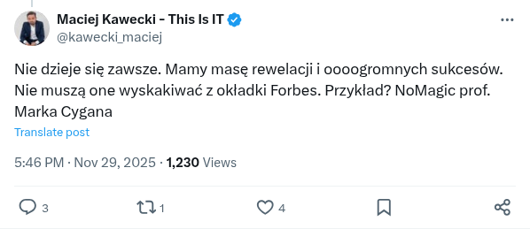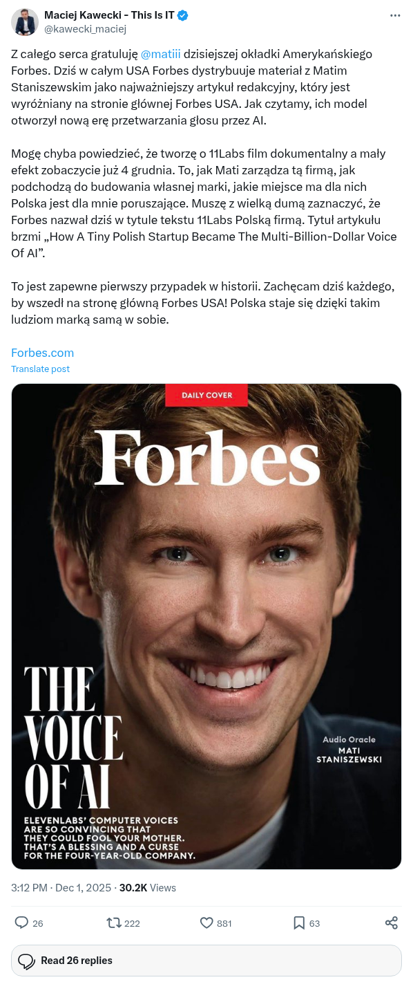 Mogę chyba powiedzieć, że tworzę o 11Labs film dokumentalny a mały efekt zobaczycie już 4 grudnia. To, jak Mati zarządza tą firmą, jak podchodzą do budowania własnej marki, jakie miejsce ma dla nich Polska jest dla mnie poruszające. Muszę z wielką dumą zaznaczyć, że Forbes nazwał dziś w tytule tekstu 11Labs Polską firmą. Tytuł artykułu brzmi „How A Tiny Polish Startup Became The Multi-Billion-Dollar Voice Of AI”.