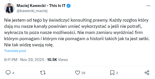 Nie jestem od tego by świadczyć konsulting prawny. Każdy rozgłos który dają mu nasze kanały powinien umieć wykorzystać a jeśli nie potrafi, wykracza to poza nasze możliwości. Nie mam zamiaru wyróżniać firm którym pomagam i którym nie pomagam a historii takich jak ta jest setki. Nie tak widzę swoją rolę.