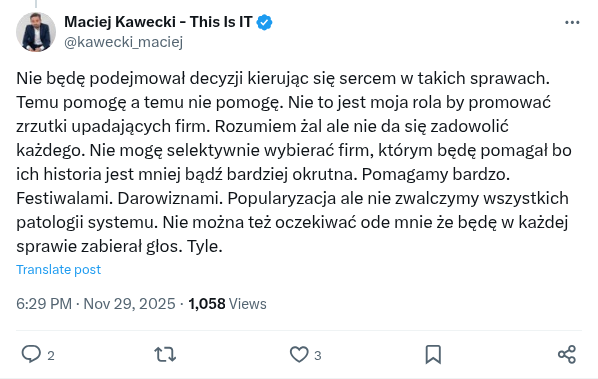 Nie będę podejmował decyzji kierując się sercem w takich sprawach. Temu pomogę a temu nie pomogę. Nie to jest moja rola by promować zrzutki upadających firm. Rozumiem żal ale nie da się zadowolić każdego. Nie mogę selektywnie wybierać firm, którym będę pomagał bo ich historia jest mniej bądź bardziej okrutna. Pomagamy bardzo. Festiwalami. Darowiznami. Popularyzacja ale nie zwalczymy wszystkich patologii systemu. Nie można też oczekiwać ode mnie że będę w każdej sprawie zabierał głos. Tyle.