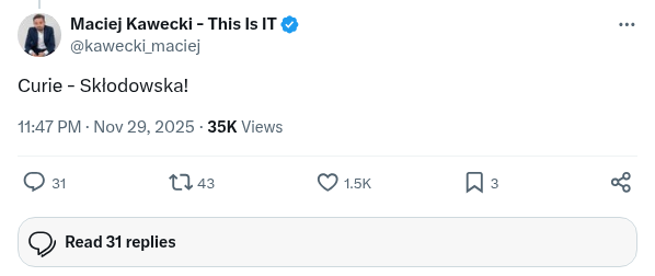 Olga Malinkiewicz i jej zespół przez ostatnie lata otrzymała wsparcie, na które nie mógł liczyć żaden znany mi startup w historii naszego kraju. Jej wyjątkowo przełomowa wtedy technologia otrzymała okładki największych gazet, dostęp do całego rynku inwestorów, moje pełne wsparcie, które wyrażałem absolutnie wszędzie. O technologii wypowiadali się premierzy, ministrowie. Otrzymała zasłużenie tytuł technologii roku Europejskiego Urzędu Parentowego. Mimo tego, nieuczciwe praktyki inwestorskie oraz nieznane mi okoliczności doprowadziły do niemal pełnego upadku firmy. W tym czasie w ciszy technologie perowskitowe, nie mające niemal żadnego wsparcia rozwijają polscy naukowcy chociażby na Uniwersytecie Warszawskim. To, co robi dr Maciej Krajewski zasługuje na poklask niemal równy temu, jaki w pełni zasłużenie przed laty otrzymała Olga Malinkiewicz. Nie mówi o nich nikt.