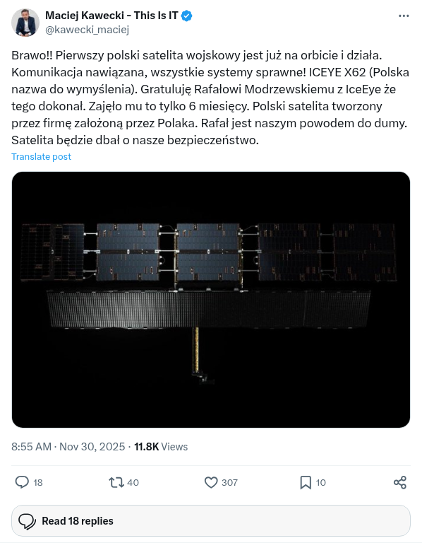Brawo!! Pierwszy polski satelita wojskowy jest już na orbicie i działa. Komunikacja nawiązana, wszystkie systemy sprawne! ICEYE X62 (Polska nazwa do wymyślenia). Gratuluję Rafałowi Modrzewskiemu z IceEye że tego dokonał. Zajęło mu to tylko 6 miesięcy. Polski satelita tworzony przez firmę założoną przez Polaka. Rafał jest naszym powodem do dumy. Satelita będzie dbał o nasze bezpieczeństwo.