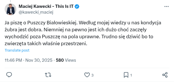 @JacekSloma Ja piszę o Puszczy Białowieskiej. Według mojej wiedzy u nas kondycja żubra jest dobra. Niemniej na pewno jest ich dużo choć zaczęły wychodzić poza Puszczę na pola uprawne. Trudno się dziwić bo to zwierzęta takich właśnie przestrzeni.