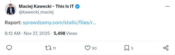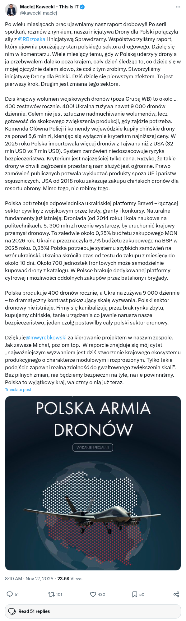 Po wielu miesiącach prac ujawniamy nasz raport drobowy!! Po serii spotkań, rozmów z rynkiem, nasza inicjatywa Drony dla Polski połączyła siły z @RBrzoska i inicjatywą Sprawdzamy. Współstworzyliśmy raport, który ujawnia porażający stan polskiego sektora drogowego. Dzielę się nim w komentarzu. Wiele miesięcy temu, gdy w Polskę uderzyły drony a ja przebywałem daleko poza krajem, cały dzień śledząc to, co dzieje się w mojej ojczyźnie dałem słowo, że coś z tym zrobimy. Stworzyliśmy inicjatywę Drony dla Polski. Dziś dzielę się pierwszym efektem. To jest pierwszy krok. Drugim jest zmiana tego sektora. Dziś krajowy wolumen wojskowych dronów (poza Grupą WB) to około … 400 zestawów rocznie. 400! Ukraina zużywa nawet 9 000 dronów dziennie. Celem nie jest sztuczne nadmuchiwanie wolumenów, lecz gotowość do skokowego zwiększenia produkcji, gdy zajdzie potrzeba. Komenda Główna Policji i komendy wojewódzkie kupiły chińskie drony za ponad 5,6 mln zł, kierując się wyłącznie kryterium najniższej ceny. W 2025 roku Polska importowała więcej dronów z Tajwanu niż z USA (32 mln USD vs 7 mln USD). System zamówień niedoszacowuje ryzyka bezpieczeństwa. Kryterium jest najczęściej tylko cena. Ryzyko, że takie drony w chwili zagrożenia przestaną nam służyć jest ogromne. Prawo zamówień publicznych pozwala wykluczać produkty spoza UE i państw sojuszniczych. USA od 2018 roku zakazuje zakupu chińskich dronów dla resortu obrony. Mimo tego, nie robimy tego. Polska potrzebuje odpowiednika ukraińskiej platformy Brave1 – łączącej sektor cywilny z wojskowym przez testy, granty i konkursy. Naturalne fundamenty już istnieją: Droniada (od 2014 roku) i koła naukowe na politechnikach. 5. 300 mln zł rocznie wystarczy, by uruchomić krajowy przemysł dronowy. To zaledwie około 0,25% budżetu zakupowego MON na 2026 rok. Ukraina przeznaczyła 6,7% budżetu zakupowego na BSP w 2025 roku. 0,25%! Polska potrzebuje systemu szybkich zamówień na wzór ukraiński. Ukraina skróciła czas od testu do zakupu z miesięcy do około 10 dni. Około 700 jednostek frontowych może samodzielnie kupować drony z katalogu. W Polsce brakuje dedykowanej platformy cyfrowej i możliwości oddolnych zakupów przez bataliony i brygady. Polska produkuje 400 dronów rocznie, a Ukraina zużywa 9 000 dziennie – to dramatyczny kontrast pokazujący skalę wyzwania. Polski sektor dronowy nie istnieje. Firmy się kanibalizują przez brak rynku zbytu, kupujemy chińskie, tanie urządzenia co jawnie narusza nasze bezpieczeństwo, jeden czołg postawiłby cały polski sektor dronowy. Dziękuję@mwyrebkowski za kierowanie projektem w naszym zespole. Jak zawsze Michał, poziom top. W raporcie znajduje się mój cytat „najważniejszym wyzwaniem jest dziś stworzenie krajowego ekosystemu produkcyjnego o charakterze modułowym i rozproszonym. Tylko takie podejście zapewni realną zdolność do gwałtownego zwiększenia skali”. Bez pilnych zmian, nie będziemy bezpieczni na tyle, na ile powinniśmy. Polska to wyjątkowy kraj, walczmy o nią już teraz.
