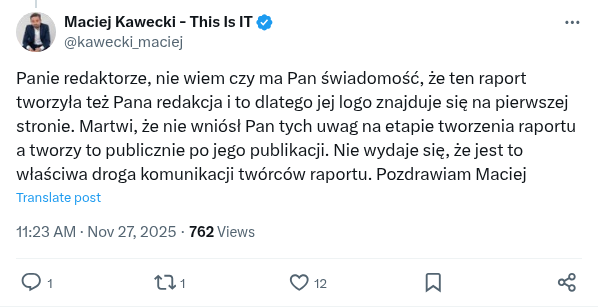 Panie redaktorze, nie wiem czy ma Pan świadomość, że ten raport tworzyła też Pana redakcja i to dlatego jej logo znajduje się na pierwszej stronie. Martwi, że nie wniósł Pan tych uwag na etapie tworzenia raportu a tworzy to publicznie po jego publikacji. Nie wydaje się, że jest to właściwa droga komunikacji twórców raportu. Pozdrawiam Maciej