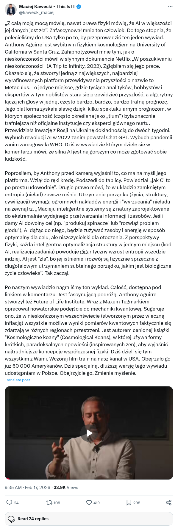 „Z całą moją mocą mówię, nawet prawa fizyki mówią, że AI w większości jej danych jest zła”. Zafascynował mnie ten człowiek. Do tego stopnia, że polecieliśmy do USA tylko po to, by przeprowadzić ten jeden wywiad. Anthony Aguirre jest wybitnym fizykiem kosmologiem na University of California w Santa Cruz. Zahipnotyzował mnie tym, jak o nieskończoności mówił w słynnym dokumencie Netflix „W poszukiwaniu nieskończoności" (A Trip to Infinity, 2022). Zgłębiłem się jego prace. Okazało się, że stworzył jedną z największych, najbardziej wyrafinowanych platform przewidywania przyszłości o nazwie to Metaculus. To jedyne miejsce, gdzie tysiące analityków, hobbystów i ekspertów w tym noblistów stara się przewidzieć przyszłość, a algorytmy łączą ich głosy w jedną, często bardzo, bardzo, bardzo trafną prognozę. Jego platforma zyskała sławę dzięki kilku spektakularnym prognozom, w których społeczność (często określana jako „tłum”) była znacznie trafniejsza niż oficjalne instytucje czy eksperci głównego nurtu. Przewidziała inwazję z Rosji na Ukrainę dokładnością do dwóch tygodni. Wybuch rewolucji AI w 2022 zanim powstał Chat GPT. Wybuch pandemii zanim zareagowała WHO. Dziś w wywiadzie którym dzielę sie w komentarzu mówi, że silna AI jest najgorszym co może zgotować sobie ludzkość.