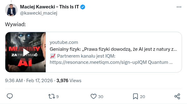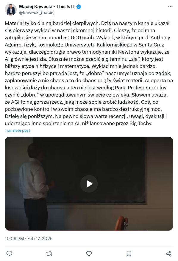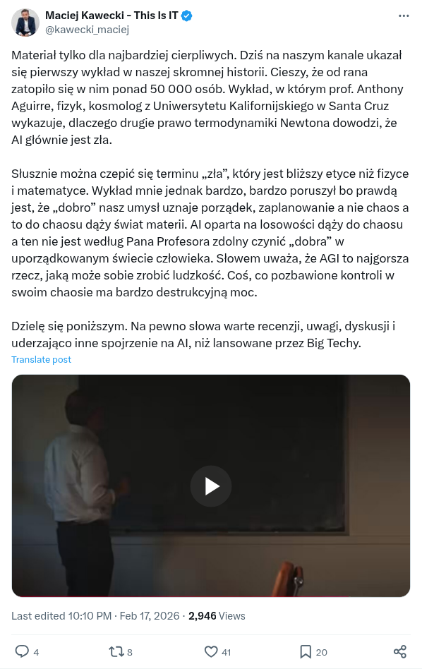 Materiał tylko dla najbardziej cierpliwych. Dziś na naszym kanale ukazał się pierwszy wykład w naszej skromnej historii. Cieszy, że od rana zatopiło się w nim ponad 50 000 osób. Wykład, w którym prof. Anthony Aguirre, fizyk, kosmolog z Uniwersytetu Kalifornijskiego w Santa Cruz wykazuje, dlaczego drugie prawo termodynamiki Newtona wykazuje, że AI głównie jest zła. Słusznie można czepić się terminu „zła”, który jest bliższy etyce niż fizyce i matematyce. Wykład mnie jednak bardzo, bardzo poruszył bo prawdą jest, że „dobro” nasz umysł uznaje porządek, zaplanowanie a nie chaos a to do chaosu dąży świat materii. AI oparta na losowości dąży do chaosu a ten nie jest według Pana Profesora zdolny czynić „dobra” w uporządkowanym świecie człowieka. Słowem uważa, że AGI to najgorsza rzecz, jaką może sobie zrobić ludzkość. Coś, co pozbawione kontroli w swoim chaosie ma bardzo destrukcyjną moc. Dzielę się poniższym. Na pewno słowa warte recenzji, uwagi, dyskusji i uderzająco inne spojrzenie na AI, niż lansowane przez Big Techy.