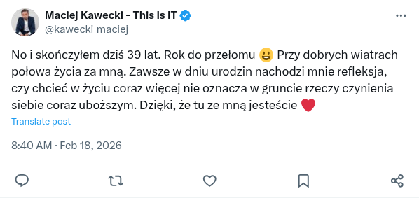 No i skończyłem dziś 39 lat. Rok do przełomu 😀 Przy dobrych wiatrach połowa życia za mną. Zawsze w dniu urodzin nachodzi mnie refleksja, czy chcieć w życiu coraz więcej nie oznacza w gruncie rzeczy czynienia siebie coraz uboższym. Dzięki, że tu ze mną jesteście ❤