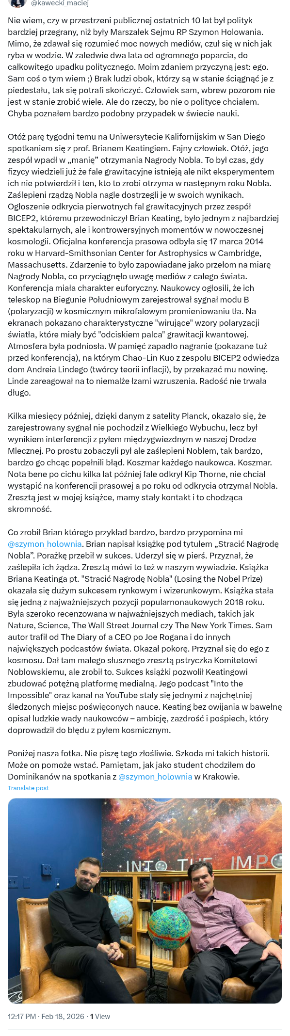 Co zrobił Brian którego przykład bardzo, bardzo przypomina mi @szymon_holownia. Brian napisał książkę pod tytułem „Stracić Nagrodę Nobla”. Porażkę przebił w sukces. Uderzył się w pierś. Przyznał, że zaślepiła ich żądza. Zresztą mówi to też w naszym wywiadzie. Książka Briana Keatinga pt. "Stracić Nagrodę Nobla" (Losing the Nobel Prize) okazała się dużym sukcesem rynkowym i wizerunkowym. Książka stała się jedną z najważniejszych pozycji popularnonaukowych 2018 roku. Była szeroko recenzowana w najważniejszych mediach, takich jak Nature, Science, The Wall Street Journal czy The New York Times. Sam autor trafił od The Diary of a CEO po Joe Rogana i do innych największych podcastów świata. Okazał pokorę. Przyznał się do ego z kosmosu. Dał tam małego słusznego zresztą pstryczka Komitetowi Noblowskiemu, ale zrobił to. Sukces książki pozwolił Keatingowi zbudować potężną platformę medialną. Jego podcast "Into the Impossible" oraz kanał na YouTube stały się jednymi z najchętniej śledzonych miejsc poświęconych nauce. Keating bez owijania w bawełnę opisał ludzkie wady naukowców – ambicję, zazdrość i pośpiech, który doprowadził do błędu z pyłem kosmicznym.