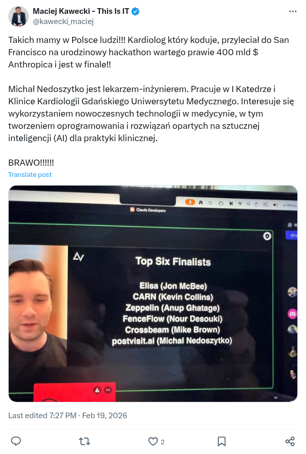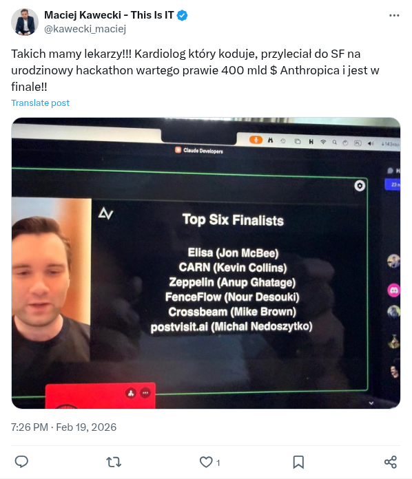 Takich mamy w Polsce ludzi!!! Kardiolog który koduje, przyleciał do San Francisco na urodzinowy hackathon wartego prawie 400 mld $ Anthropica i jest w finale!!